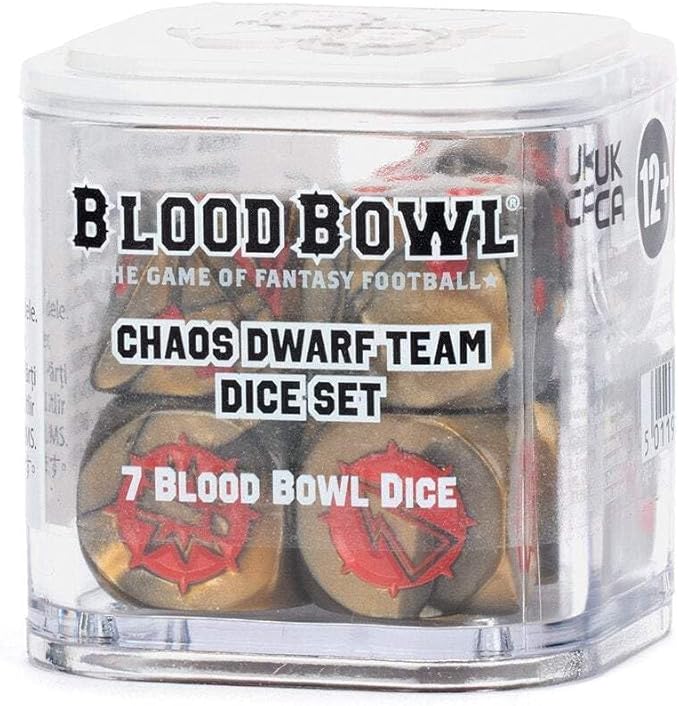 „The perfect companion to a Nurgle Blood Bowl team, this set of handsome(ish) dice in clear green with orange markings, featuring a Nurgle icon in place of the 6, includes: 3 Blood Bowl Block dice, 2 6-sided dice, 1 8-sided die and 1 16-sided die“. Released September 2018.