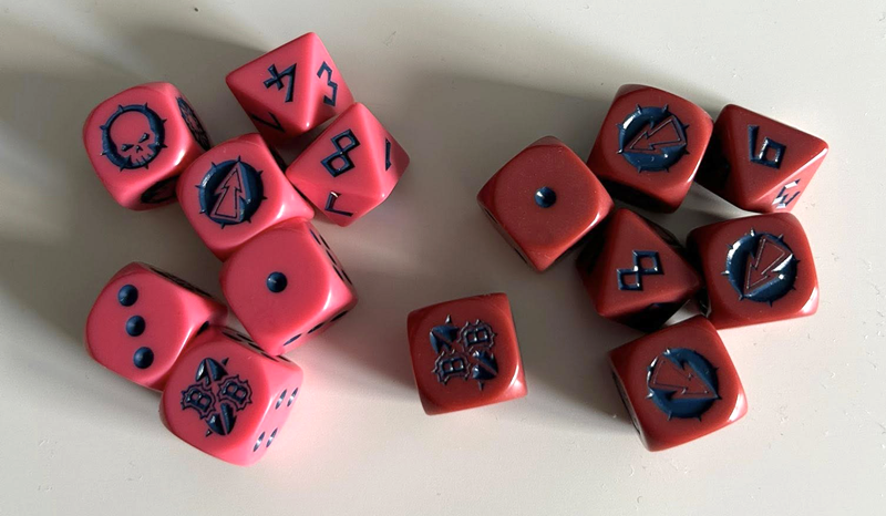 This updated set of Chaos Chosen team dice look like they’re made from iron forged in hellfire, with high-contrast red markings, including the Chaos Chosen team icon on the 6-sided dice.
