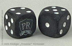Alessandro „Tannhauser Gate“ Cilioni produced a different set of Commemorative dice with the different logo on the 6 and on the sides the classic pips, a 3x translucent colours mix (green, blue & red) with gold glitters. Thx a lot, Alessandro, for the pict! 🙂