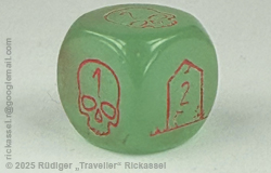 „Want to replace doing a coin toss and damaging your figures? This die is a D2! Tired of having to roll a D6 and divide to make a D3? This die is a D3! Want to just have something freakin’ awesome? Here it is! There are 3 different Pumpkin sides and 3 different Tombstone sides, all numbered 1-3.“